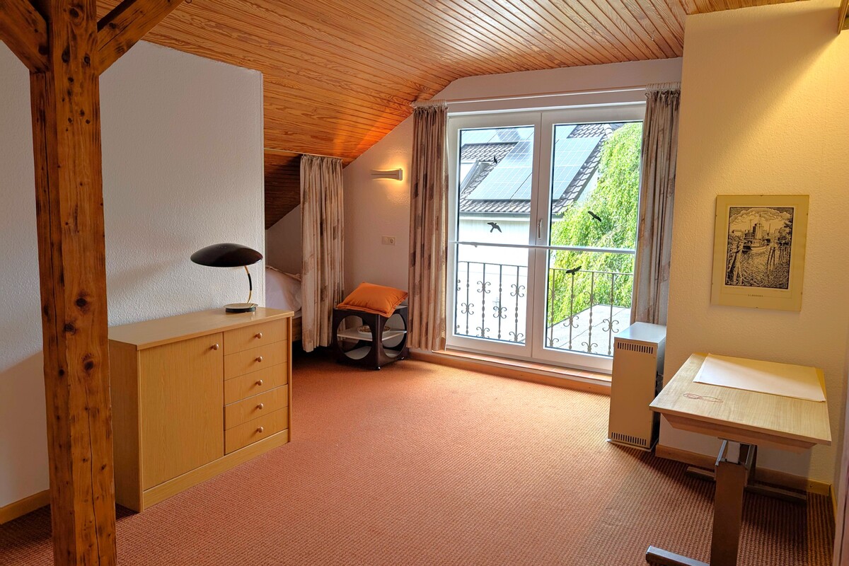 Das Haus wurde schon so geplant, dass das Dachgeschoss einmal nachträglich ausgebaut werden kann, wahlweise als Ergänzung zum Erdgeschoss, oder z.B. als Gäste-Appartement. Der Treppenaufgang befindet sich in der Diele zwischen Hauseingangstür und der Tür zum EG-Wohnbereich. Eine Stahlbetondecke zwischen den Etagen dient dem besseren Schallschutz, und das Flachdach der angebauten Garage wurde statisch so ausgelegt, dass es später einmal als Balkon für das Obergeschoss genutzt werden kann.
