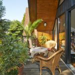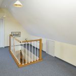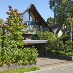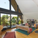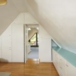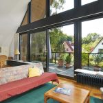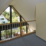 Über eine offene Holztreppe gelangt man in das Dachgeschoss mit einem gemütlichen Studio / Gästezimmer und einer großzügigen Empore, ideal nutzbar als Arbeits- oder Fitnessbereich. Von hier hat man, dank der komplett verglasten Hausfront, eine herrliche Aussicht über das Wohnzimmer und die Loggia hinweg in die naturnahe Umgebung der Nachbarschaft.