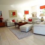 Flur, Ess- und Wohnzimmer sind mit großen kalksandsteinfarbenen Bodenfliesen ausgestattet, die Schlafzimmer mit einem edlen Parkettboden.