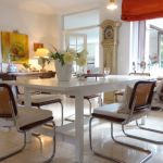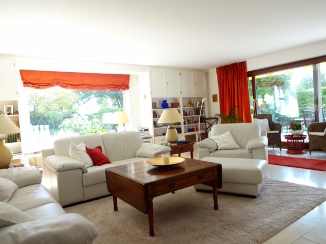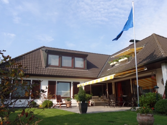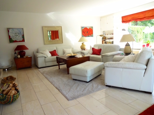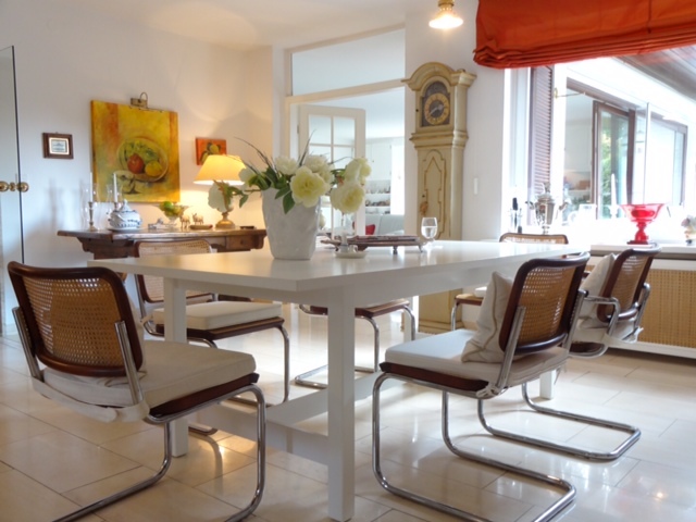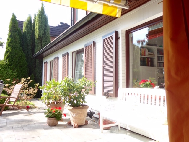 Das 160m² große Erdgeschoss ist offen gestaltet. Über den Flur gelangt man in den geräumigen Essbereich, von dem aus man durch große Flügeltüren in das großzügige Wohnzimmer mit Kamin und Zugang zur Terrasse gelangt. Durch die Belichtung von zwei Seiten erscheint der Raum sehr hell und freundlich. Die Terrasse lässt sich mit einer elektrischen Markise zu einem schattigen Plätzchen umgestalten. Die Fensterfront zur Terrasse wird durch Sicherheits-Rollläden geschützt. An den übrigen Fenstern im Erdgeschoss sind Fensterläden angebracht.