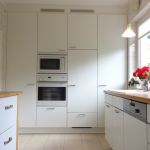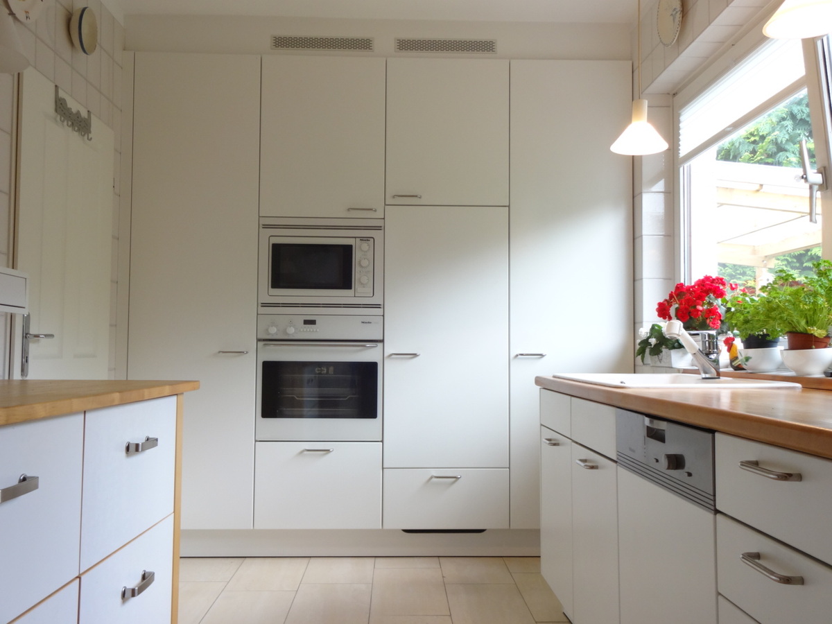 Die Küche ist sowohl vom Flur als auch vom Esszimmer aus zugänglich. Ausgestattet ist die helle und gepflegte Einbauküche vorwiegend mit Miele-Elektrogeräten.