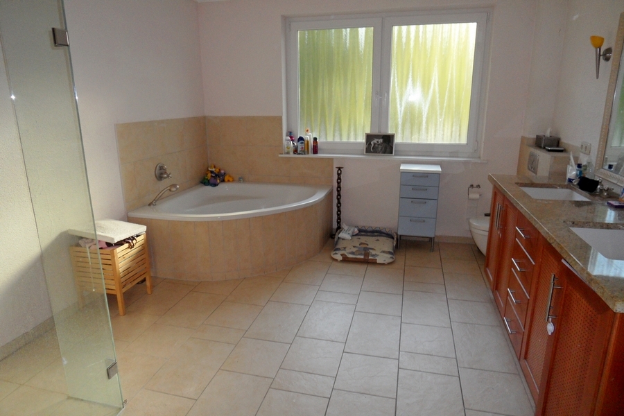 - Einbauküche, neuwertig - ausgestattet mit: Geschirrspüler, Kühlschrank, Ceranfeld und Dunstabzug nach außen. - Gästebad/WC, neuwertig - ausgestattet mit: Fenster, Natursteinboden, WC, große bodentiefe Dusche/Regenbrause - Vollbad, neuwertig - ausgestattet mit: Fenster, bodentiefe Dusche, Eckbadewanne, Doppelwaschtisch, modernen Wand-/Bodenfliesen