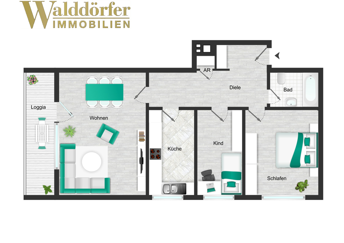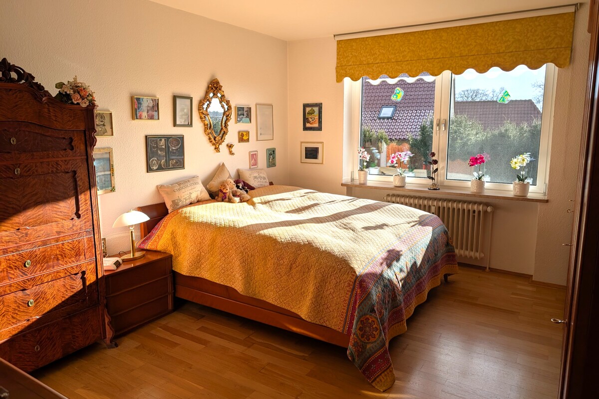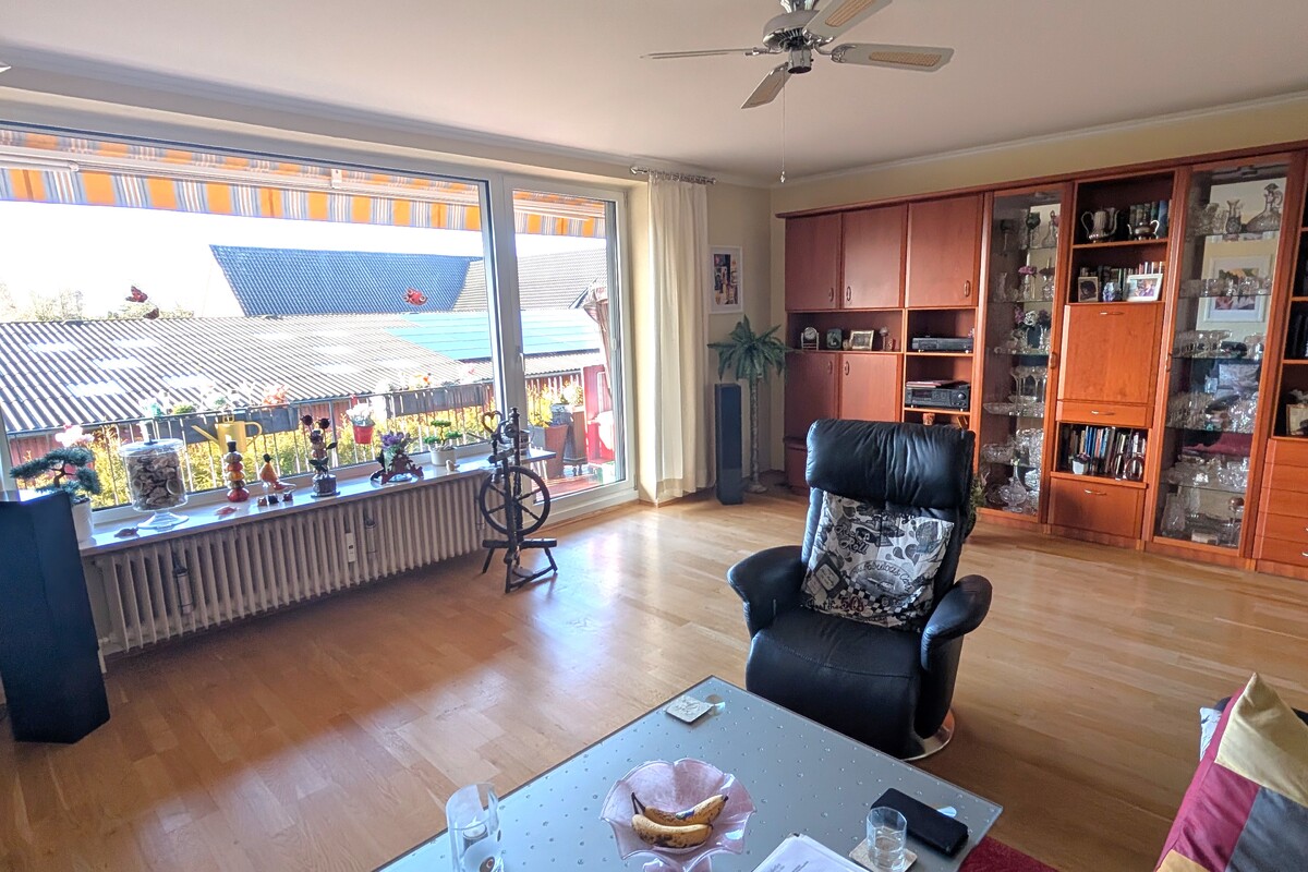 Die Wohnfläche von 90m² verteilt sich auf 3 Wohn-/Schlafzimmer, Küche, Diele, Abstellraum, Bad mit Dusche und einen großen West-Balkon mit Sonnenmarkise.