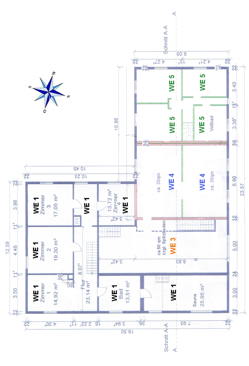 Das Haus bietet ausreichend Platz für 3, 4 oder 5 Wohneinheiten (in den beigefügten Grundrissen sind fünf mögliche Wohneinheiten dargestellt); die Flächen der verschiedenen Wohneinheiten können jedoch auch zusammengelegt werden.