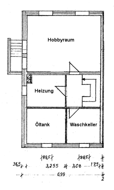 Der Keller, ausgestattet mit einer Außentreppe, verfügt über einen ca. 35m² großen Hobbyraum (z.Zt. als Wohnbüro genutzt), einen Hauswirtschaftsraum, einen Raum für die Heizöltanks und einen für die BUDERUS-Ölzentralheizung (Bj. 2003) mit zentraler Warmwasseraufbereitung.