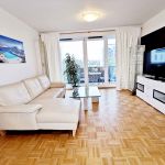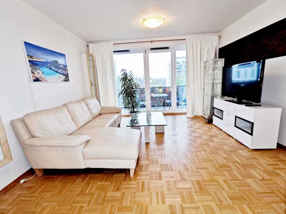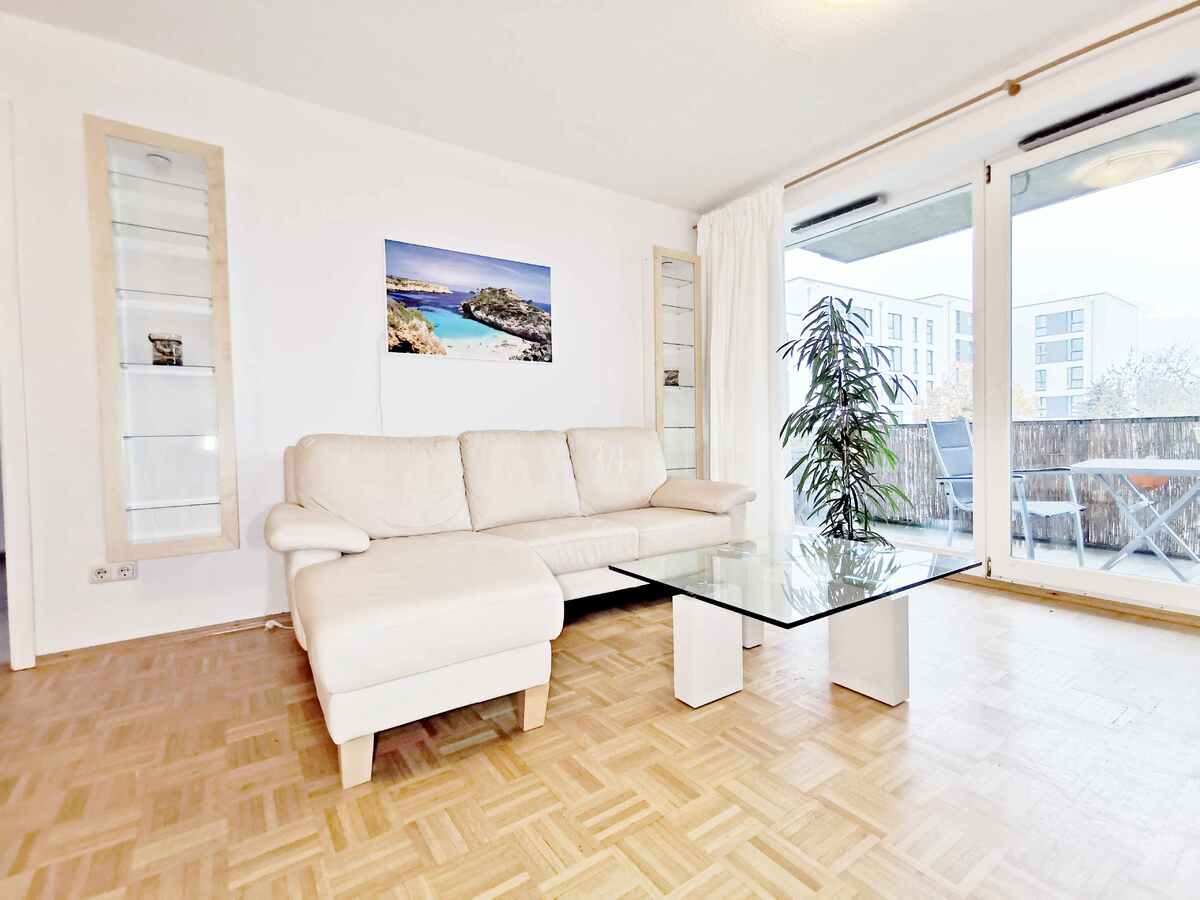 Der großzügige Flur sowie das Wohnzimmer sind mit hellem Stäbchen-Parkett ausgestattet. Das Wohnzimmer besticht durch die große Fensterfront. Dank der Süd-Ausrichtung können Sie hier den ganzen Tag reichlich Tageslicht genießen. Auch den gemütlichen Süd-Balkon (ca. 9m²) erreichen Sie von hier aus.