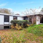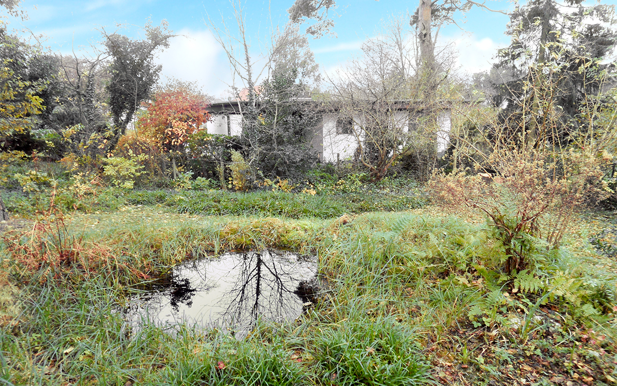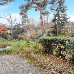 Das pflegeleicht angelegte Grundstück ist am Hang gelegen. Das ermöglichte den Einbau von Fenstern im Tiefgeschoss. Bei den rückwärtigen Nachbarhäusern handelt es sich ebenfalls um Flachdachbungalows, die aufgrund der Hanglage alle etwas tiefer liegen und dadurch auch bei niedriger Grenzbepflanzung kaum sichtbar sind.