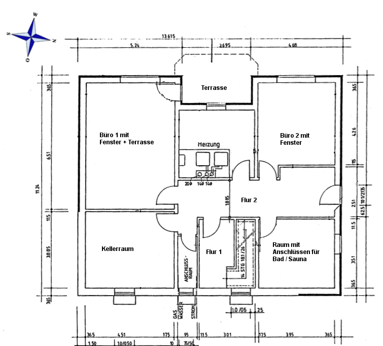 Das Haus ist voll unterkellert, mit einer lichten Höhe von ca. 2,30m. Ein ebenerdiger Seiteneingang neben den Garagen ist vorhanden. Zwei als Büro gekennzeichneten Tiefgeschossräume mit hervorragender Belichtung können auch wohnlich genutzt werden. Das Büro 1 verfügt neben dem großen Fenster auch über eine Terrassenzugang zur ebenerdigen West-Terrasse. Das Büro 2 wird durch ein Doppelfenster belichtet. In einem weiteren Raum sind Badanschlüsse vorhanden. Der Einbau einer Sauna ist möglich.