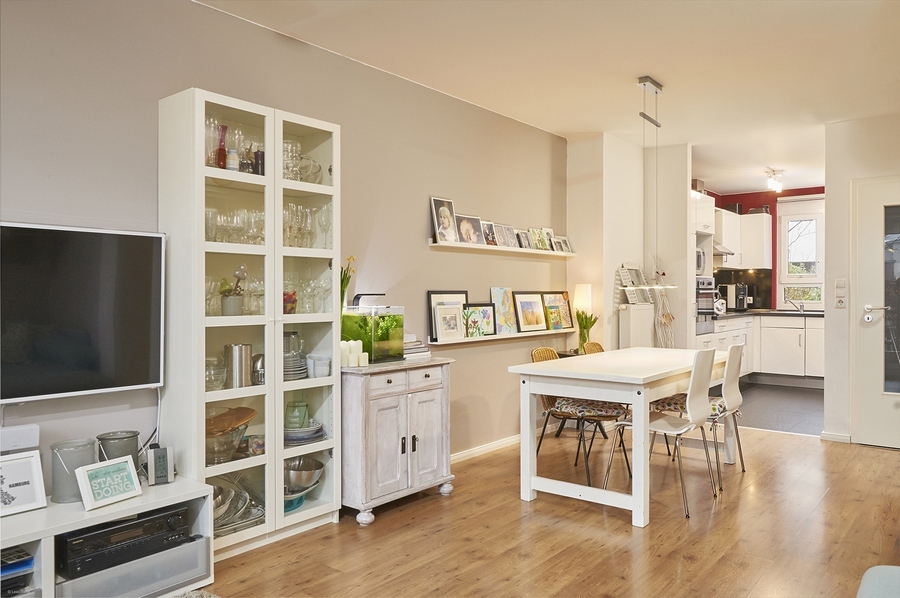 Im Erdgeschoss befinden sich die Eingangsdiele, ein Gäste-WC, das Wohn- und Esszimmer mit Terrassen-/Gartenzugang, so wie eine offen gestaltete Küche.