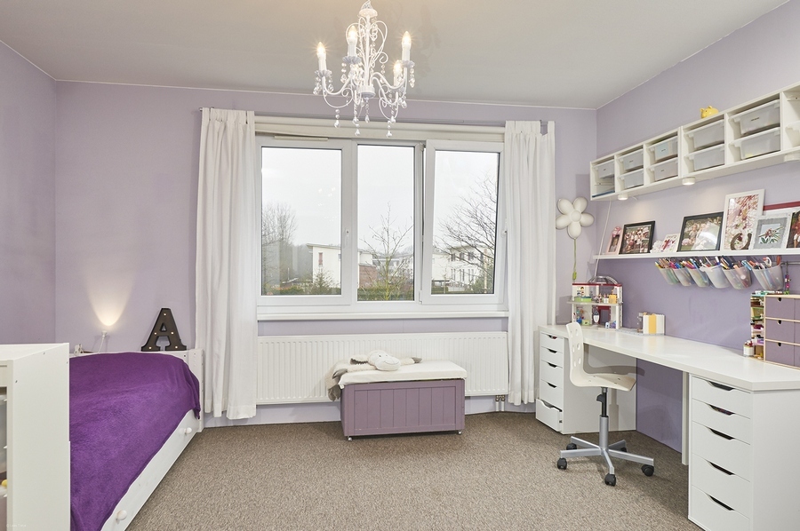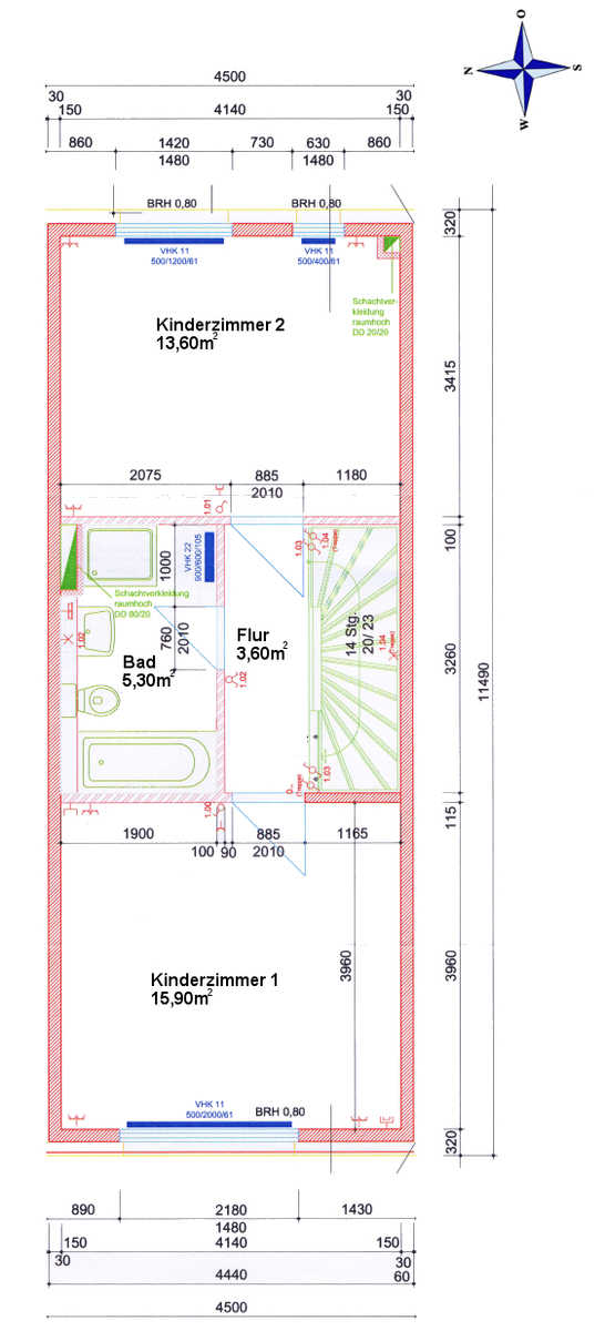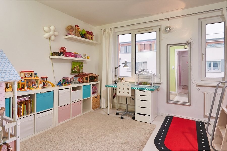 Über eine Buchenholztreppe gelangt man in das 1. Obergeschoss mit zwei großzügigen Kinderzimmer sowie dem Vollbad mit Dusche und Badewanne.