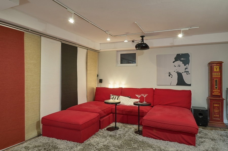 Im wohnlichen Tiefgeschoss mit ca. 2,40m hoher Decke befinden sich ein Hauswirtschaftsraum sowie ein fast 30m² großer, als gemütliches Heimkino und Gästezimmer eingerichteter Raum.