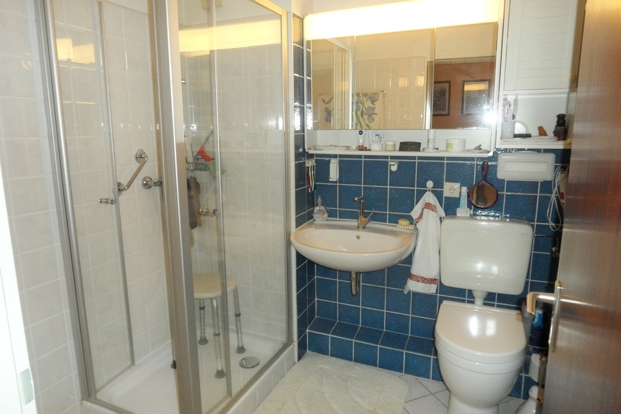 Das Bad wurde vor einigen Jahren komplett erneuert und hat nun einen großen Duschbereich anstelle der Badewanne. Das danebenliegende Gäste-WC wird heute als Abstellraum genutzt, kann aber jederzeit mit geringen Aufwand wieder reaktiviert werden.