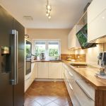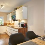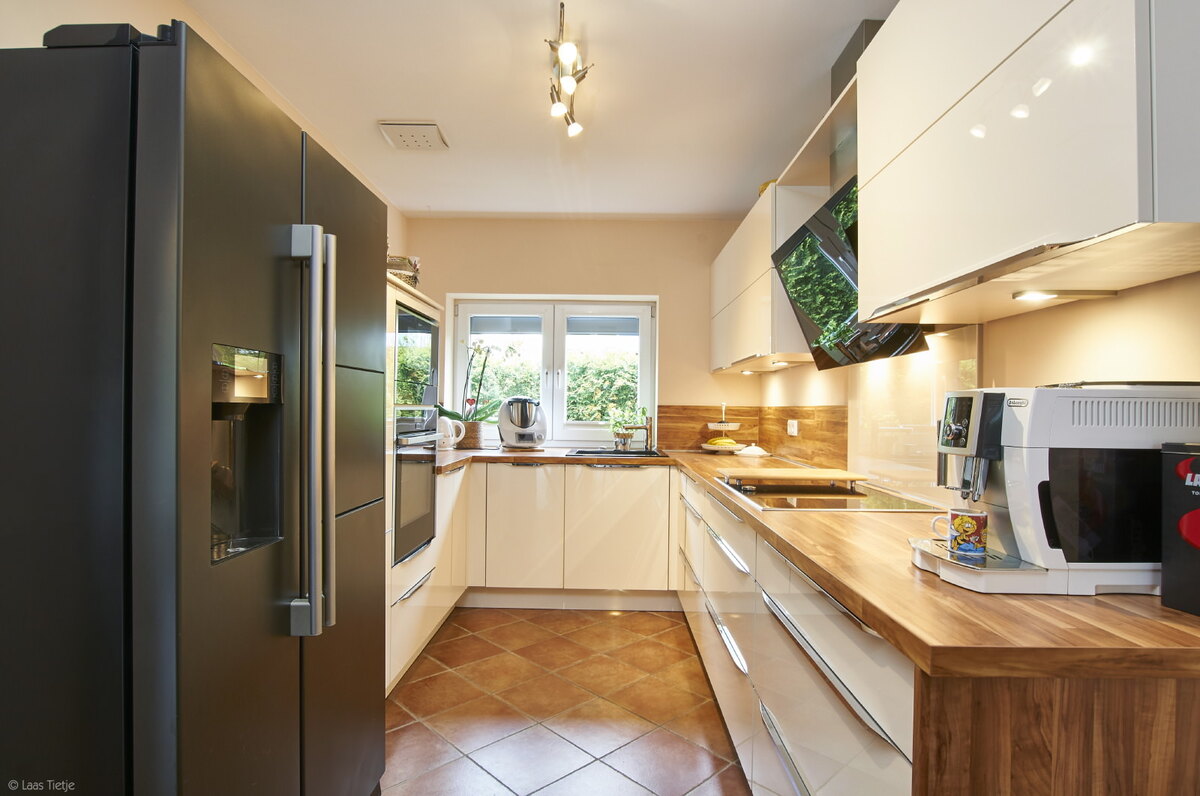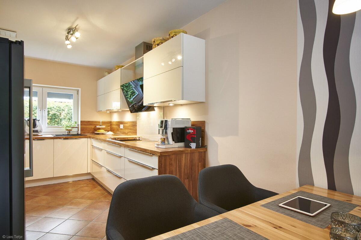 Gäste WC mit Fenster und eine hochmoderne und offene Einbauküche. Alle Fenster im Erdgeschoss sind mit elektrischen Außenrollläden versehen.