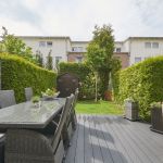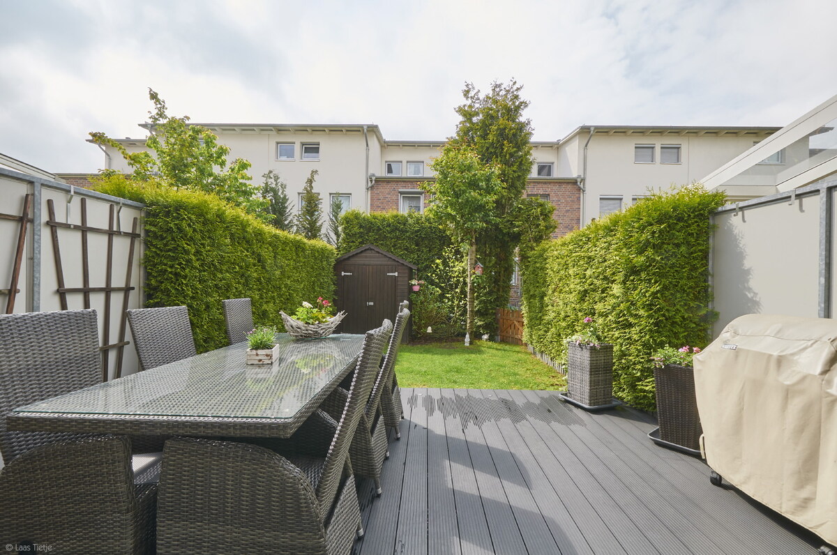 Das insgesamt ca. 98m² große Grundstück ist nach Süden ausgerichtet. Die angebrachte elektrische Markise spendet auf der schönen WPC-Terrasse Schatten an sonnigen Tagen.