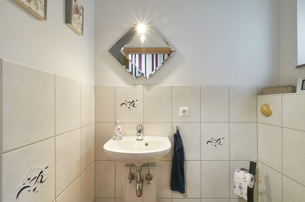 Der Fußboden im Wohnbereich (EG) wurde mit terracottafarbenen Fliesen (inkl. Fußbodenheizung) ausgestattet; der Wohnbereich im OG und im DG ist mit Laminat versehen. Vollbad im OG und Gäste-WC im EG sind hell gefliest.