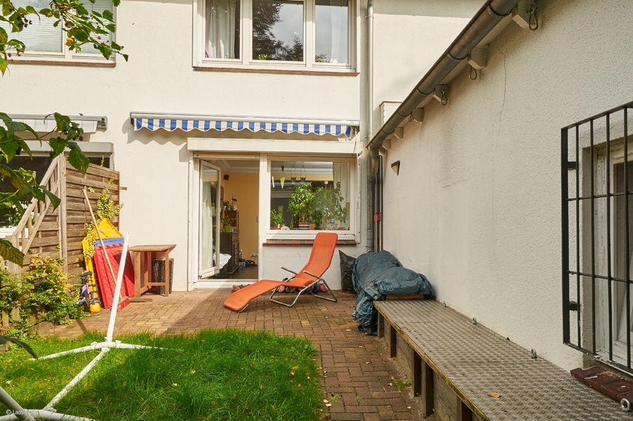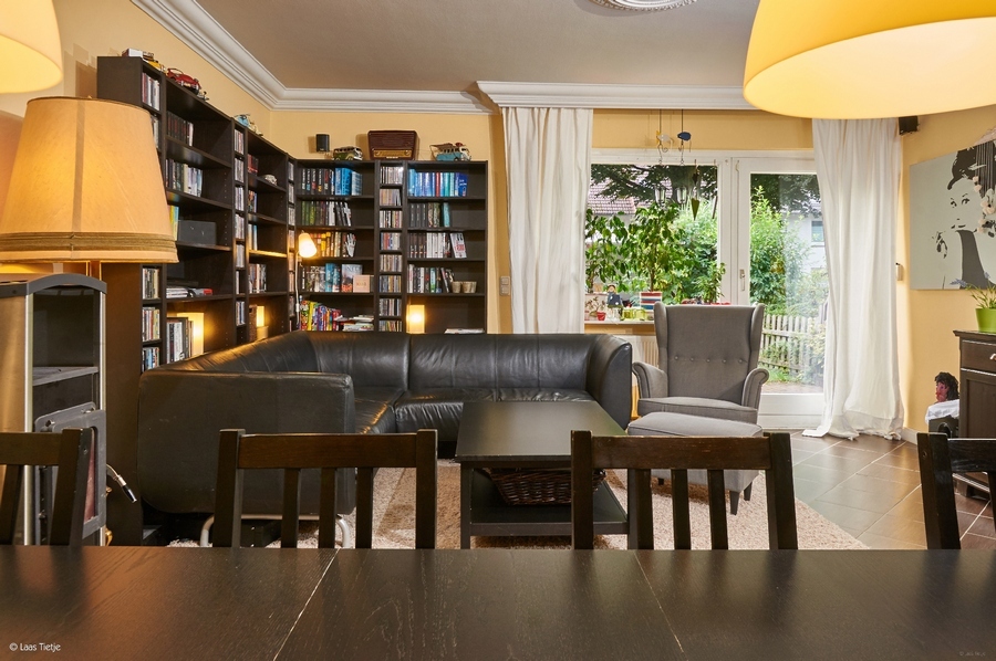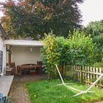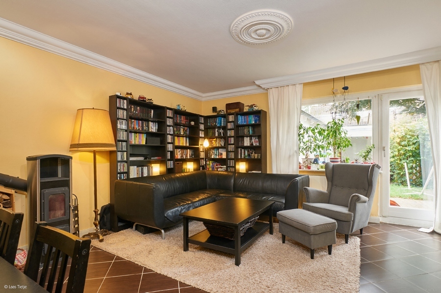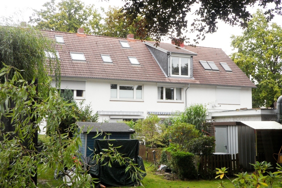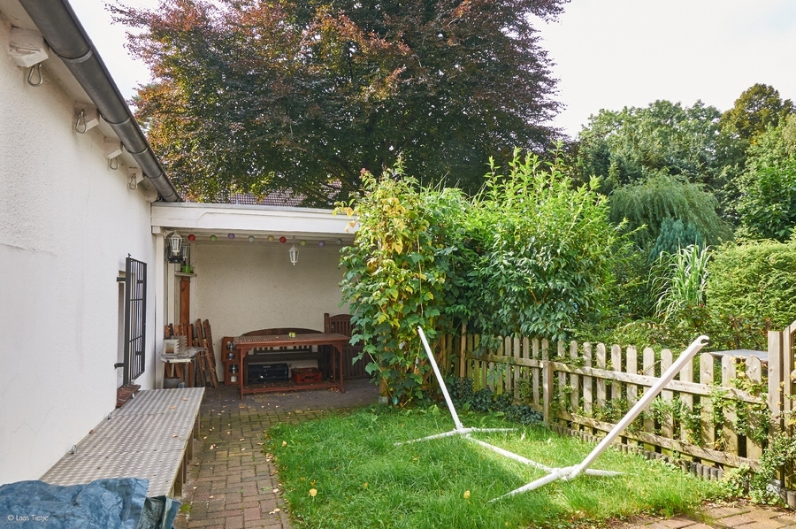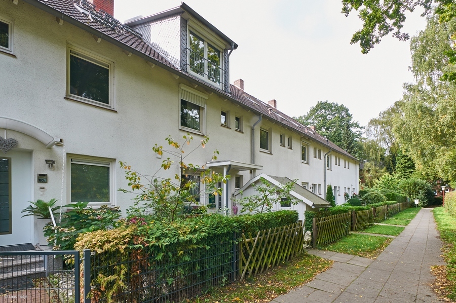 Kaum 650m vom Saseler Markt entfernt führt ein kleiner Privatweg zu den Eingängen der 6er Reihenhauszeile. Im Vorgarten steht ein Holzhäuschen, ideal zum Unterstellen von Fahrrädern und Spielgeräten. Der kleine, nach Südwesten orientierte Garten bietet zwischen einer Sonnenterrasse und einem wettergeschützten Freisitz am Grundstücksende gerade noch ausreichend Platz, um eine Schaukel aufzustellen. Der angrenzender Flachbau des Nachbarhauses dämmt die Geräusche der nahe Hauptstraße fast vollständig.