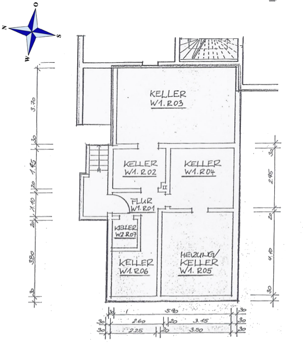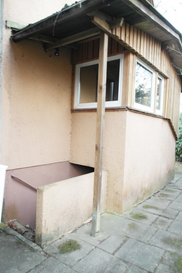 Als der über eine Außentreppe erreichbare Vollkeller 1953 errichtet wurde, gab es weder "weisse Wannen" noch Anstrichmittel wie "Elefantenhaut." Ein Keller diente als Lagerort für Briketts, Kohle, Äpfel, Kartoffeln, Eingemachtes etc.. Der damalige Eigentümer war Tischler, und hatte hier sein Vorratslager und seine Werkstatt eingerichtet.