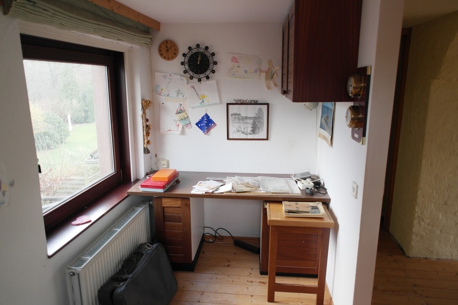 Im Erdgeschoss befinden sich die Eingangsdiele, ein (erweiterbares) Duschbad mit Fenster, ein 22,9m² großes Zimmer mit Kaminofen, ein kleineres Zwischenraum (9,3m²) so wie eine 14,3m² große Wohnküche, ausgestattet mit zeitgemäßer EBK, Terrassentür zur Südterrasse und zusätzlichem Westfenster.