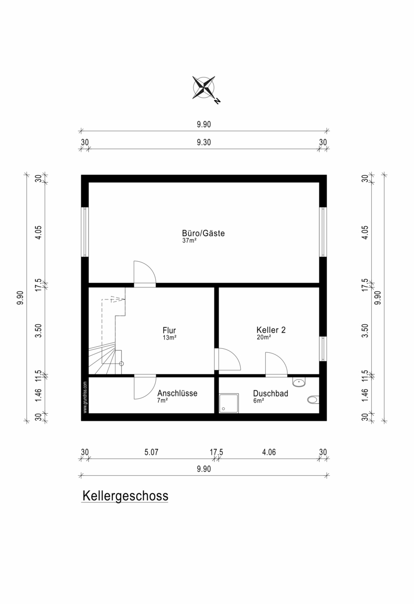 Im 77m² großen Tiefgeschoss (Deckenhöhe 2,30m) stehen weitere wohnlich nutzbare Räume mit Tageslicht zur Verfügung.