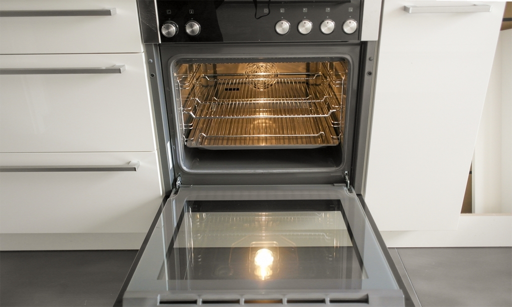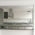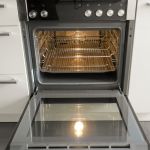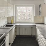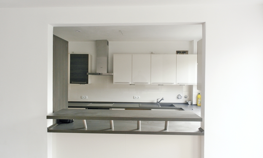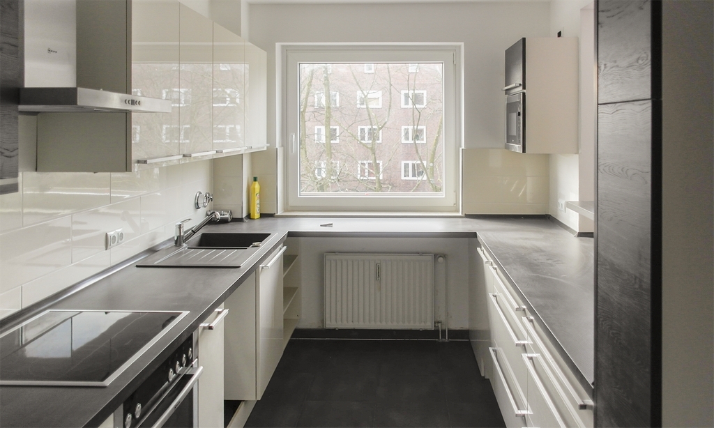 Sie ist mit einer neuen, hochwertigen Einbauküche ausgestattet. Mikrowelle, E-Herd mit Ceran-Kochfeld sowie Platz für einen Geschirrspüler und einen hohen Kühlschrank sind vorhanden. Die Küche ist über einen Tresen, der in einer breiten Durchreiche montiert ist, mit dem Wohnzimmer verbunden.