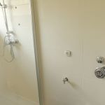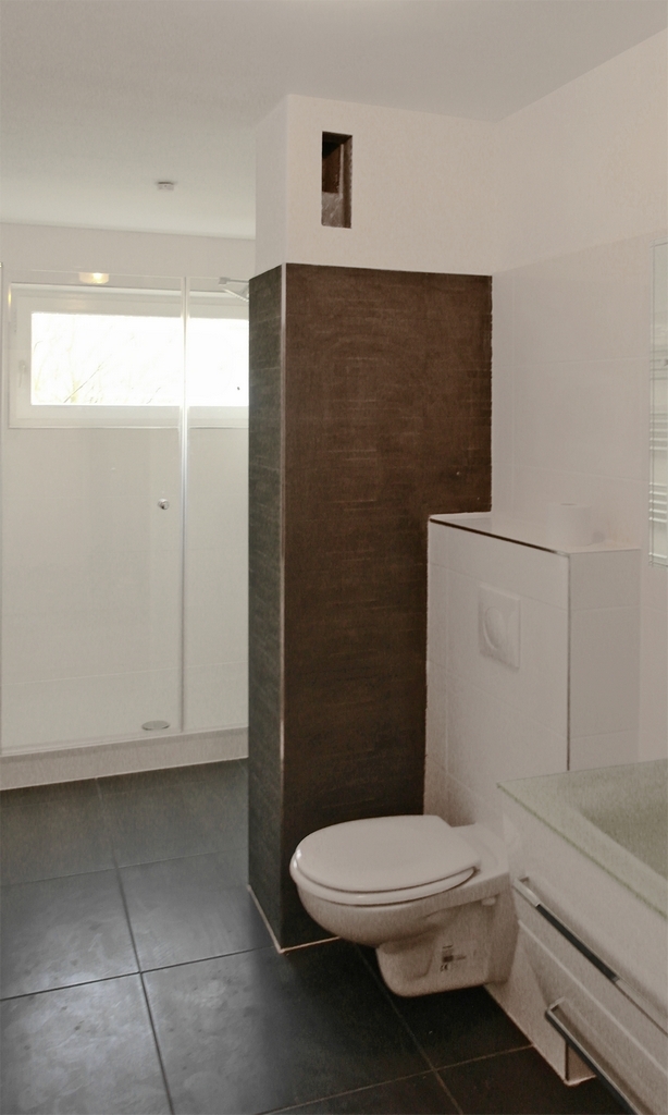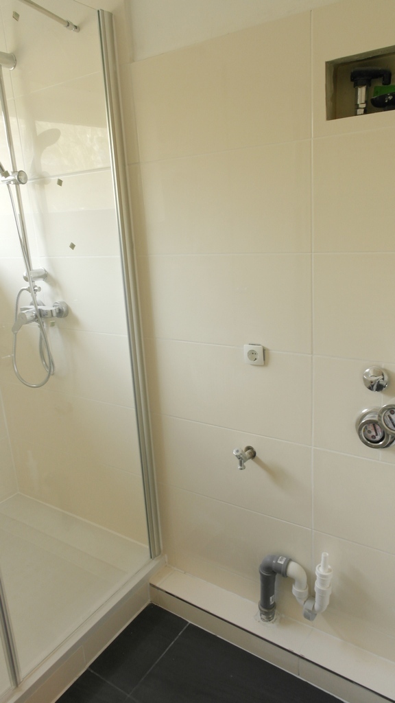 Das Duschbad wurde komplett neu gestaltet und beinhaltet eine große bodenebene Dusche, neue Wand- und Bodenfliesen sowie neue Handtuchheizkörper, WC, Waschtisch mit Unterschrank und einen Spiegelschrank.