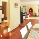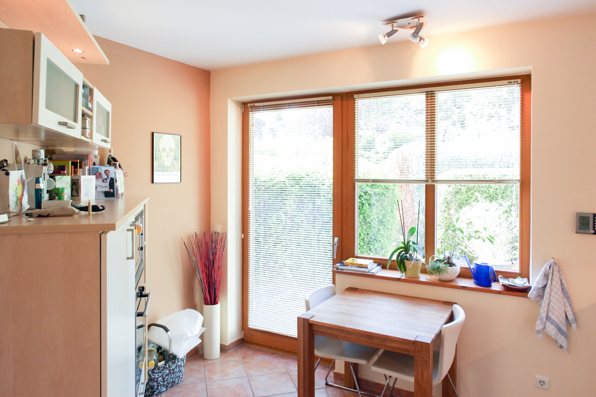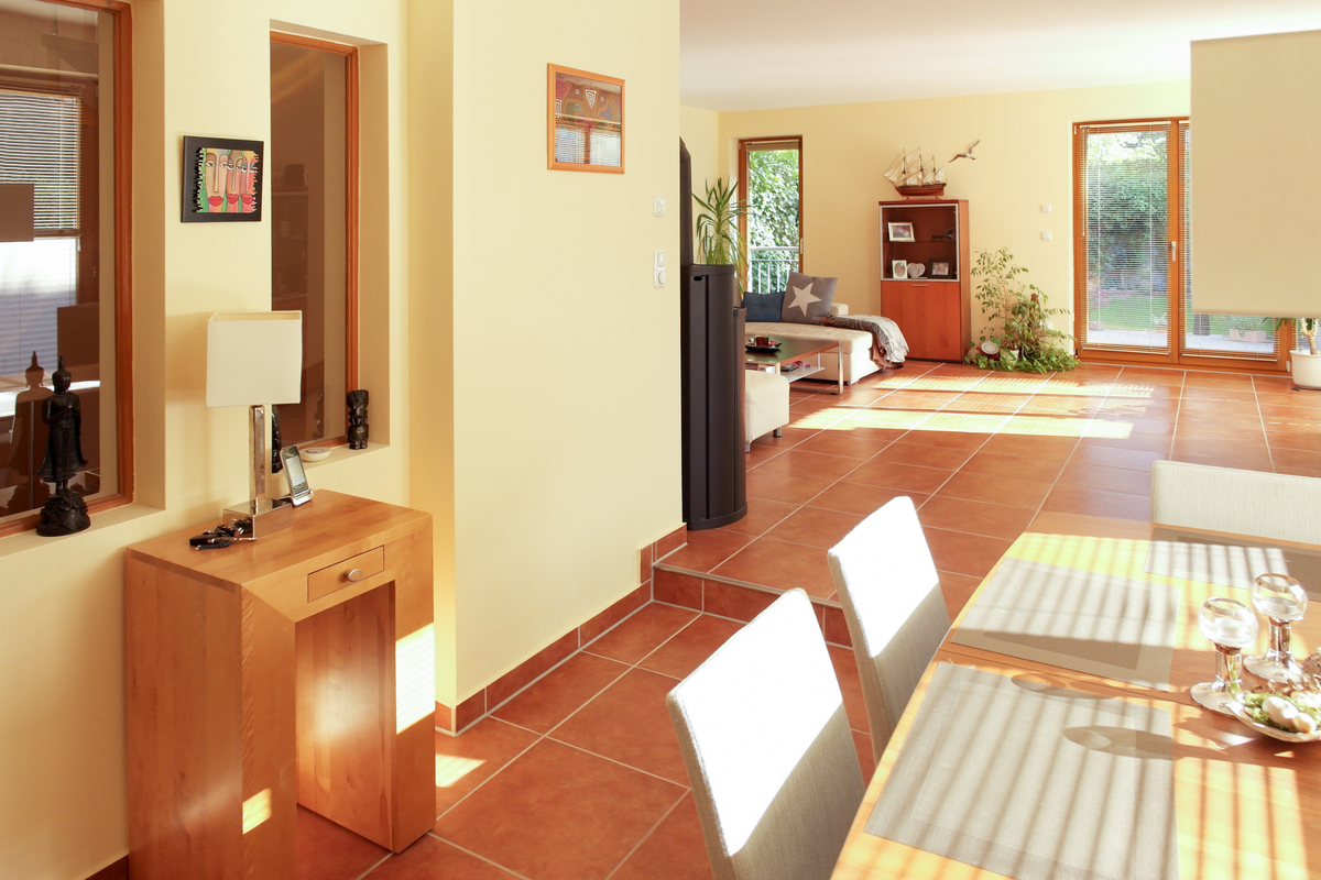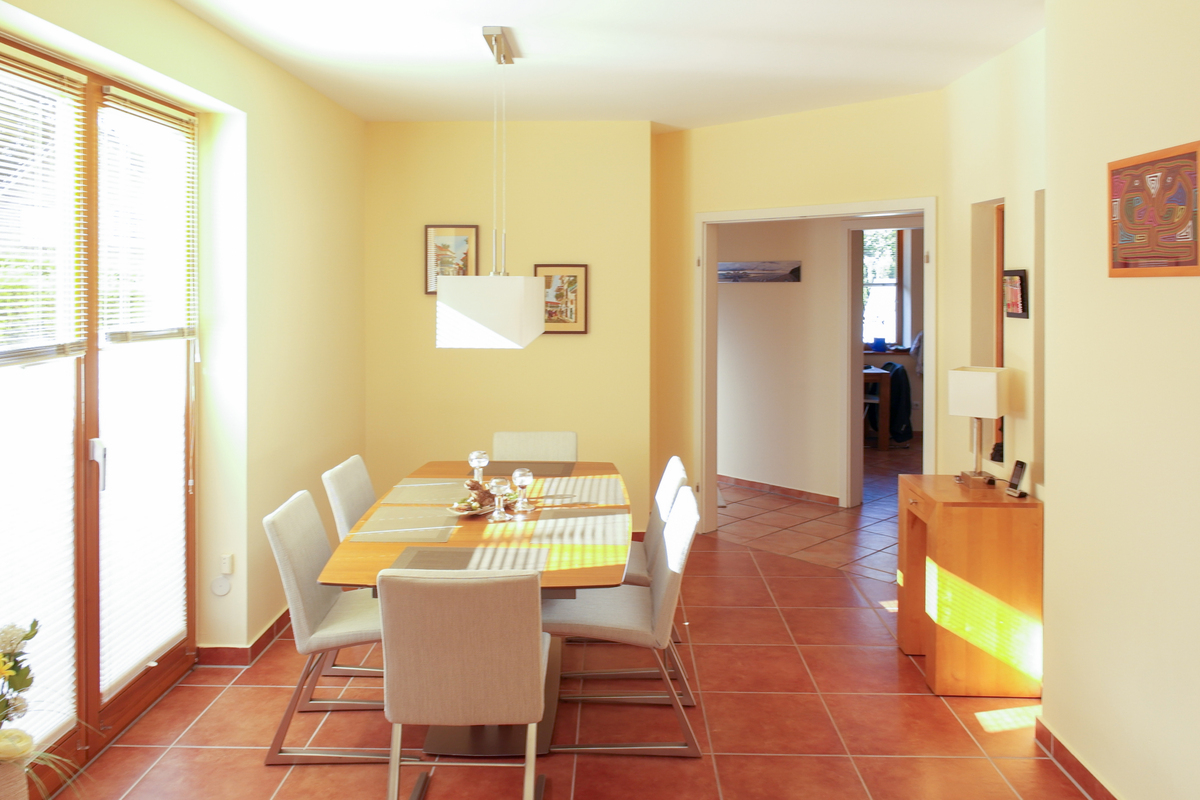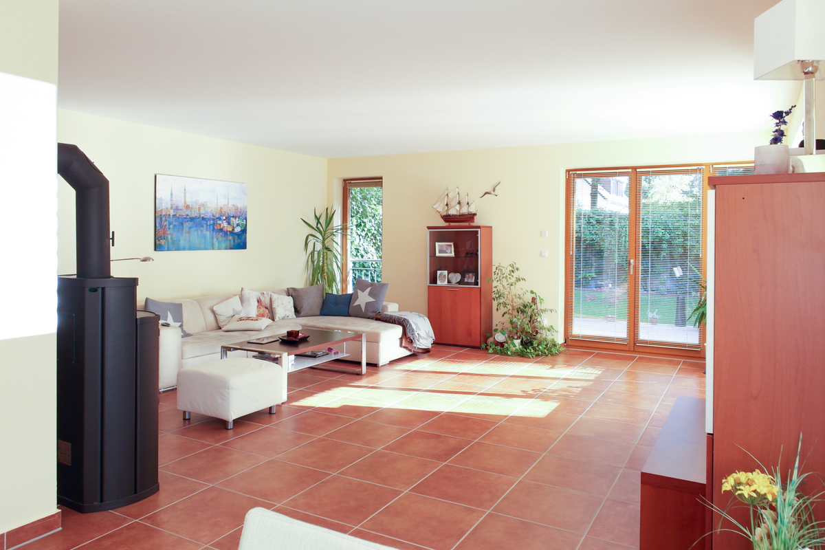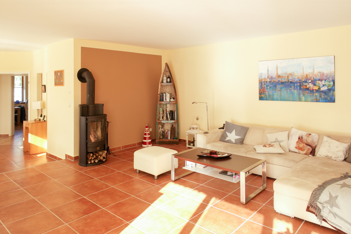 Das Erdgeschoss ist komplett gefliest und verfügt über eine Fußbodenheizung. Gemütliche Wärme kann zusätzliche der Kaminofen im Wohnzimmer erzeugen.