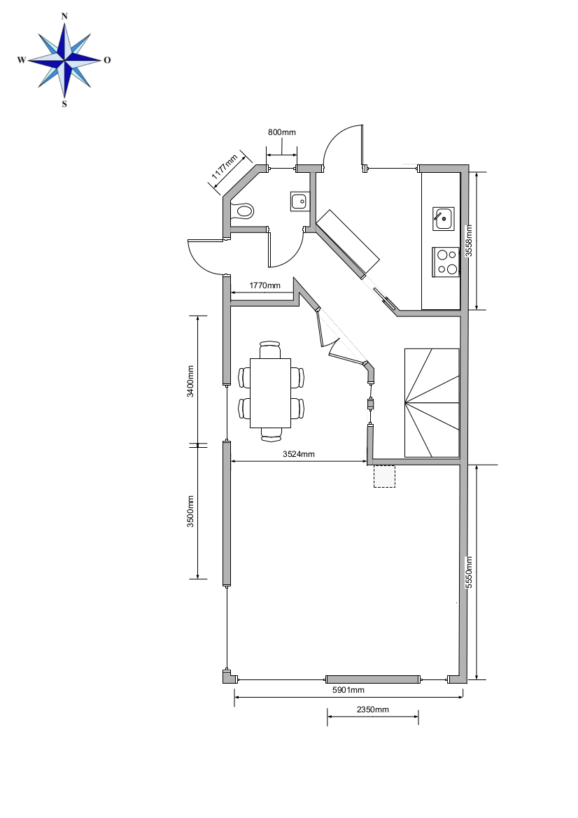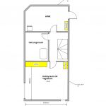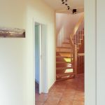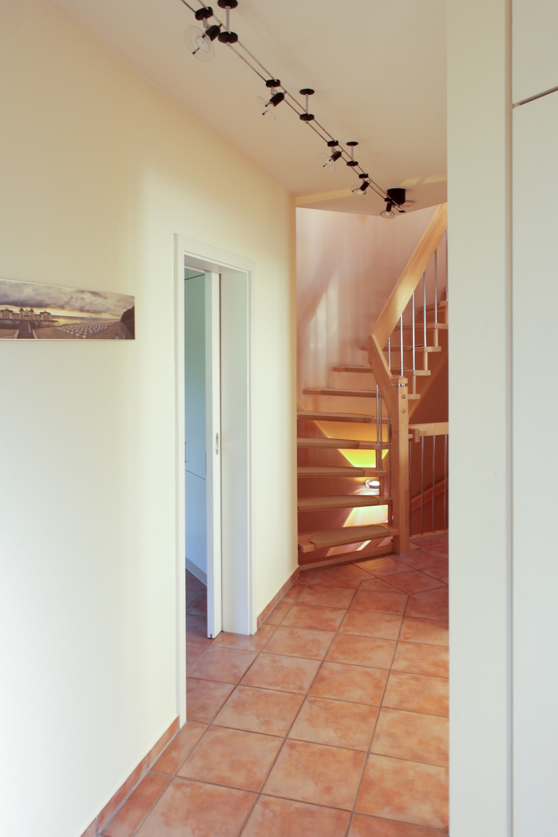 Über den Hauseingang betritt man den zentralen Hausflur, welcher Zugang zum Wohn- und Essbereich, Gäste-WC und zur Küche bietet. Von hier aus führt eine Holztreppe in das Ober- und Untergeschoss.