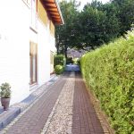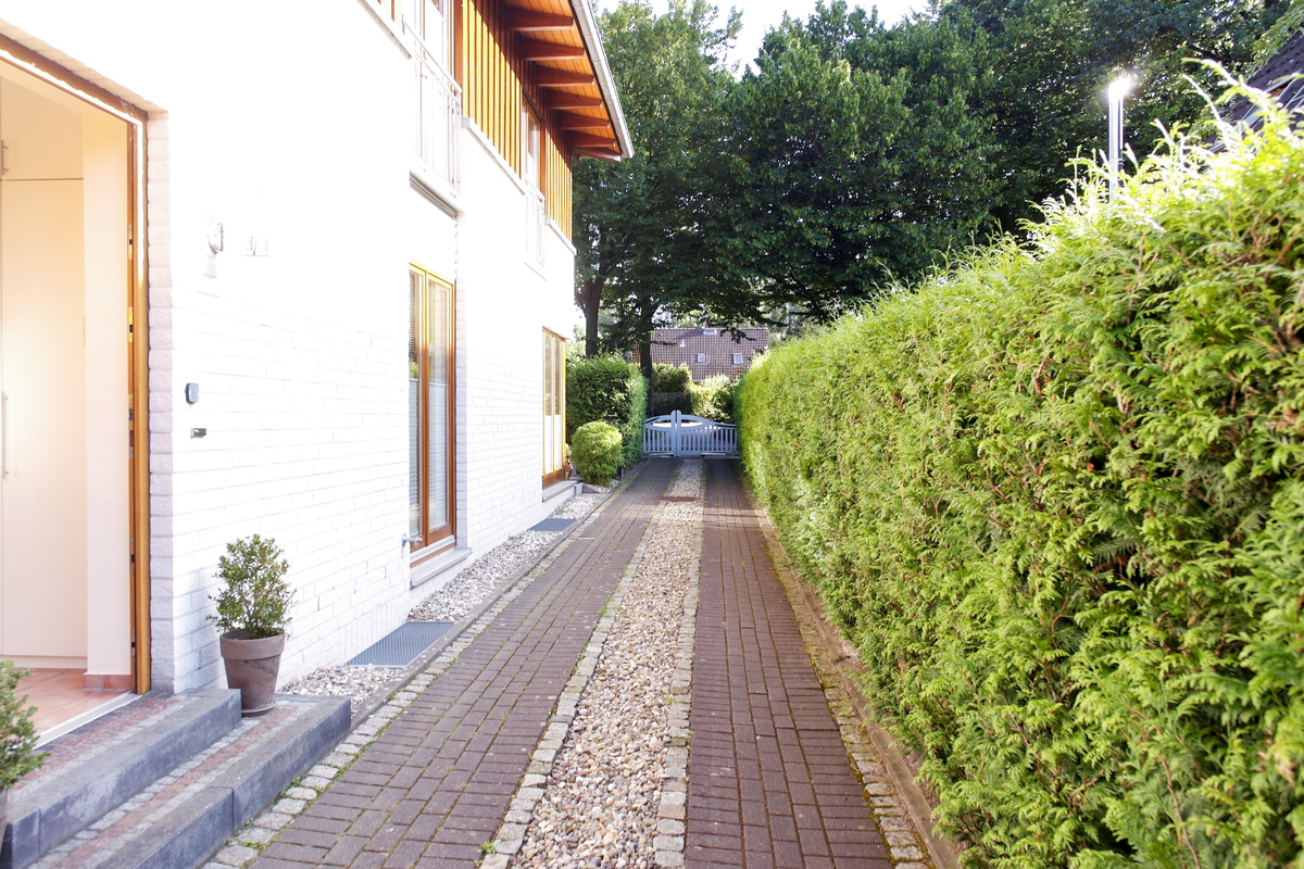 Die Einfahrt und der Weg zum Hauseingang sind gepflastert. Zum Haus gehört ein Carport. Das Zufahrtstor lässt sich per Fernbedienung öffnen/schließen.