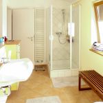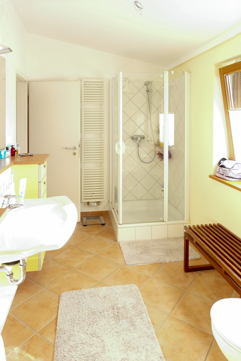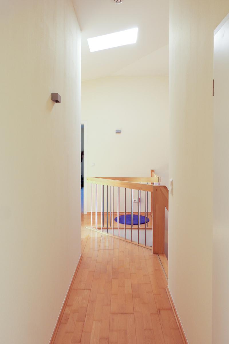 Im Obergeschoss ist der Flur mit Parkett belegt. Er biete Zugang zum Vollbad, zum sep. Duschbad und zu den drei mit Teppichboden ausgelegten Schlafräumen.