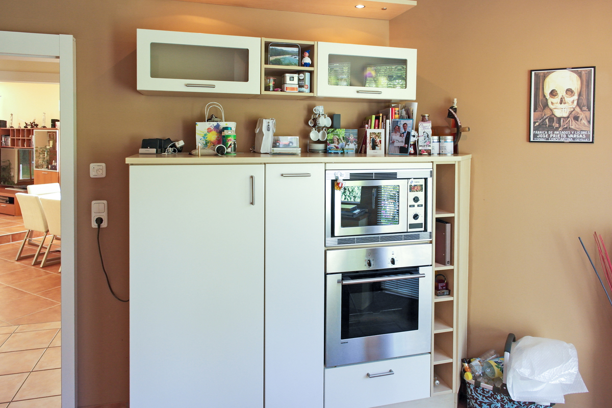 Die Küche ist mit einer Einbauküche mit Backofen, Ceran-Kochfeld, Geschirrspüler, Mikrowelle, Kühlschrank mit Tiefkühlfach und mit einem Essplatz ausgestattet.