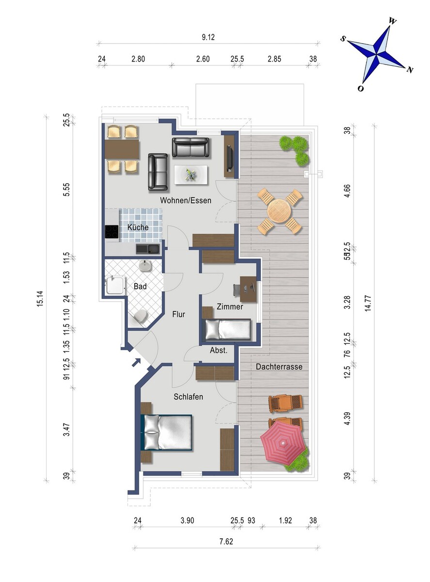 Die 34m² große Dachterrasse ist sowohl über das helle, freundliche Wohnzimmer mit offener Einbauküche, als auch über das Schlafzimmer zugänglich. Das dritte, kleinere Zimmer ist ideal nutzbar als Büro, Gäste- oder Kinderzimmer.
