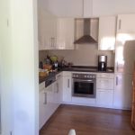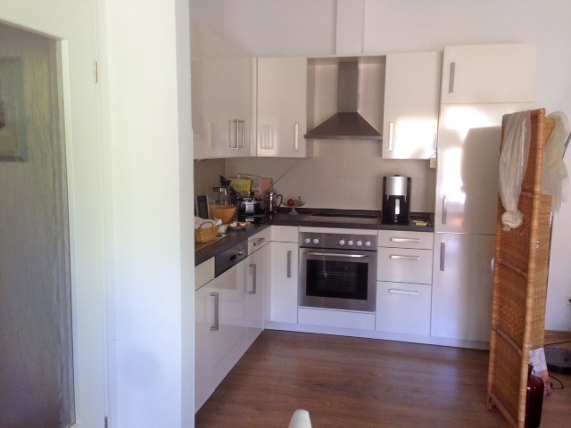 Die hochwertige Einbauküche mit Backofen, Ceran-Kochfeld, Geschirrspüler und Kühlschrank ist ein Blickfang und lädt zum Kochen ein.