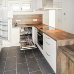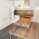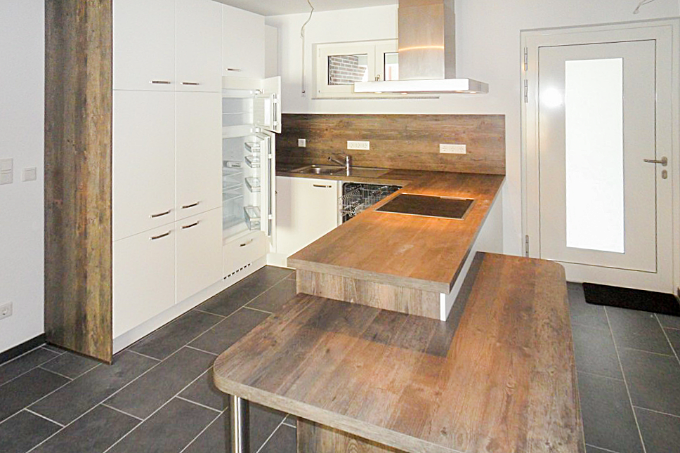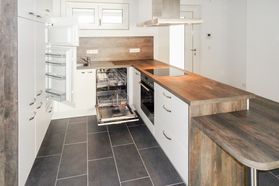 - Einbauküche mit: Kühl-/Gefrierkombination, Geschirrspüler, Herd, Ceran-Kochfeld Unterschrank/Ecklösung, Esstresen in Tischhöhe