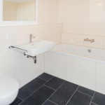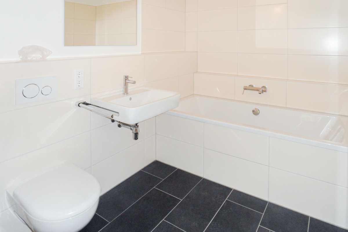 - Bad mit Badewanne, wandhängendem WC, Waschtisch und Handtuchtrockner