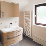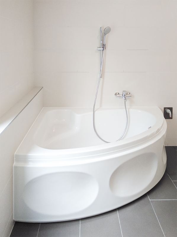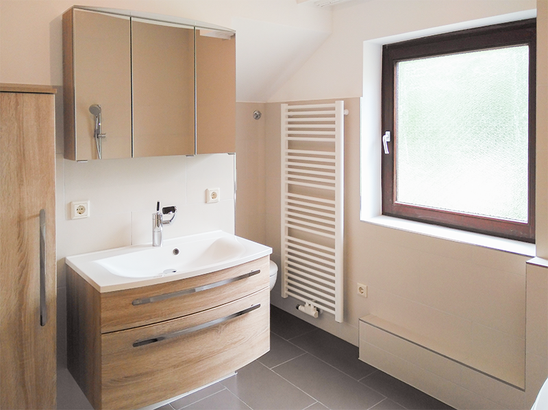 Das Bad im OG ist mit wandhängendem WC, Handtuchheizkörper, Eckbadewanne und einem Waschmaschinenanschluss neu ausgestattet.