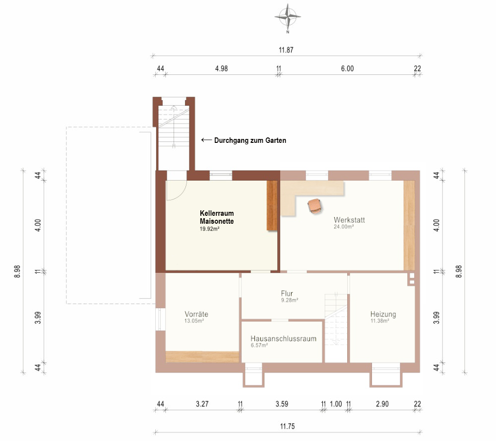 Der Wohnungseingang im Erdgeschoss ist durch eine Abtrennung des Flurs separiert, so dass beide Wohnungen im Gebäude - bis auf den gemeinsamen Vorflur - getrennt sind. Zusätzlich steht ein Kellerraum von ca. 20m² Nutzfläche zur Verfügung. Über diesen ist der rückwärtige Gartenbereich zugänglich. Beheizt wird das Gebäude mit einer Gas-Brennwerheizung inkl. Warmwasserspeicher.
