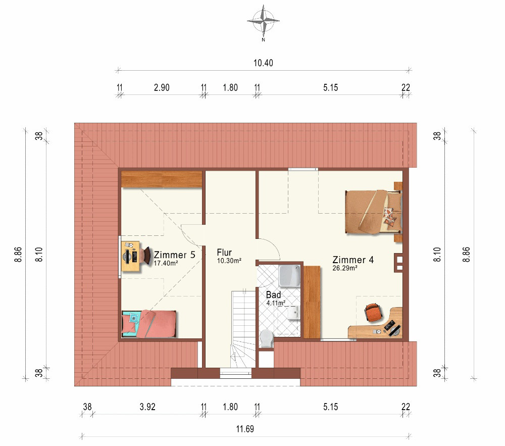 Im Dachgeschoss befinden sich ein Duschbad und zwei weitere Zimmer.