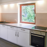 Zur Austattung der Einbauküche gehören Spülmaschine, Backofen, Cerankochfeld, eine Spüle aus Silgranit, sowie eine Kühl- und Gefrierkombination.