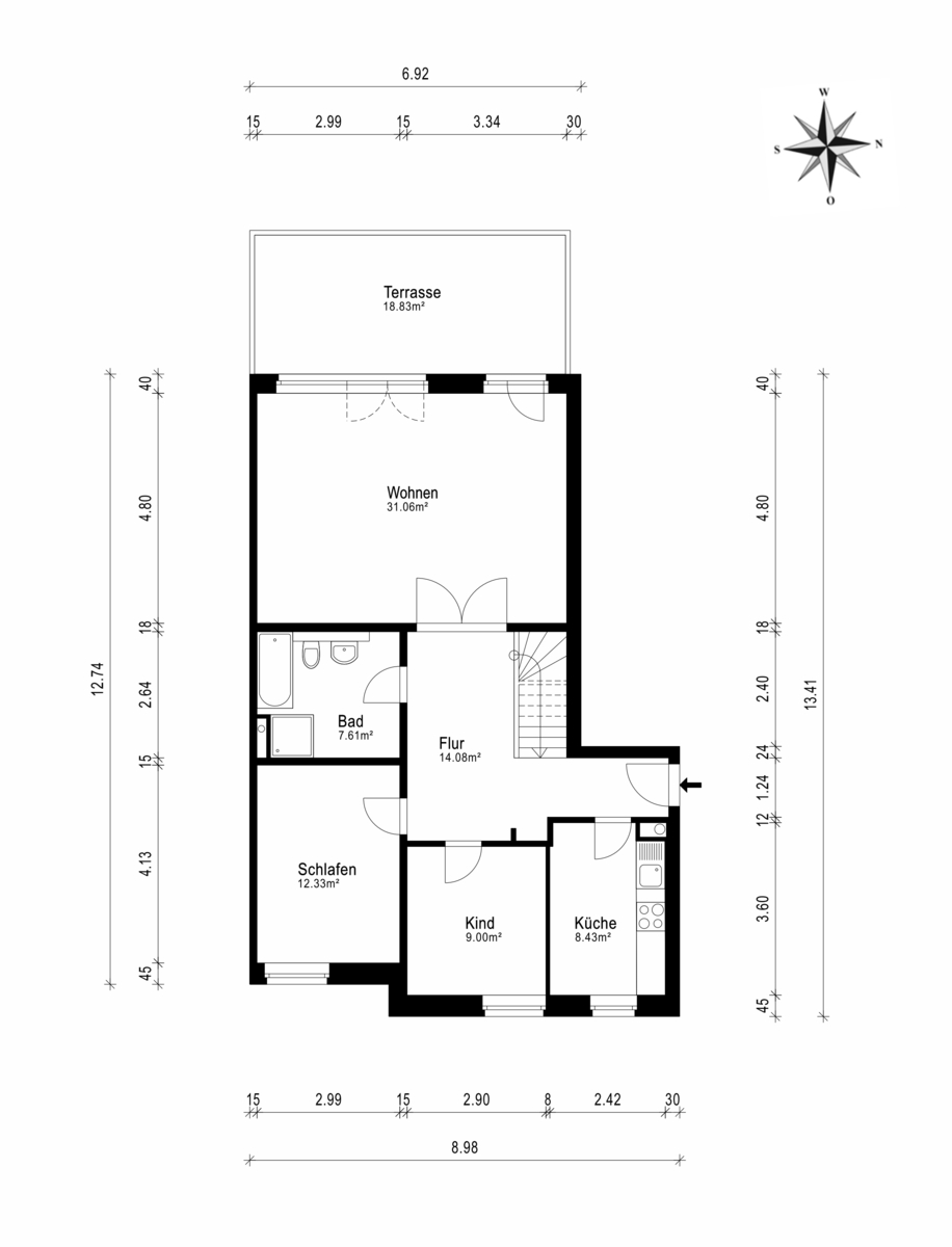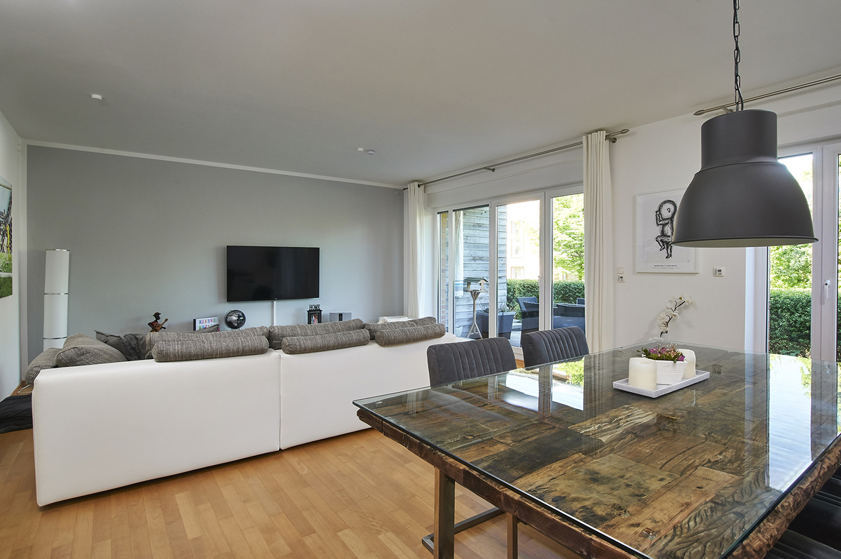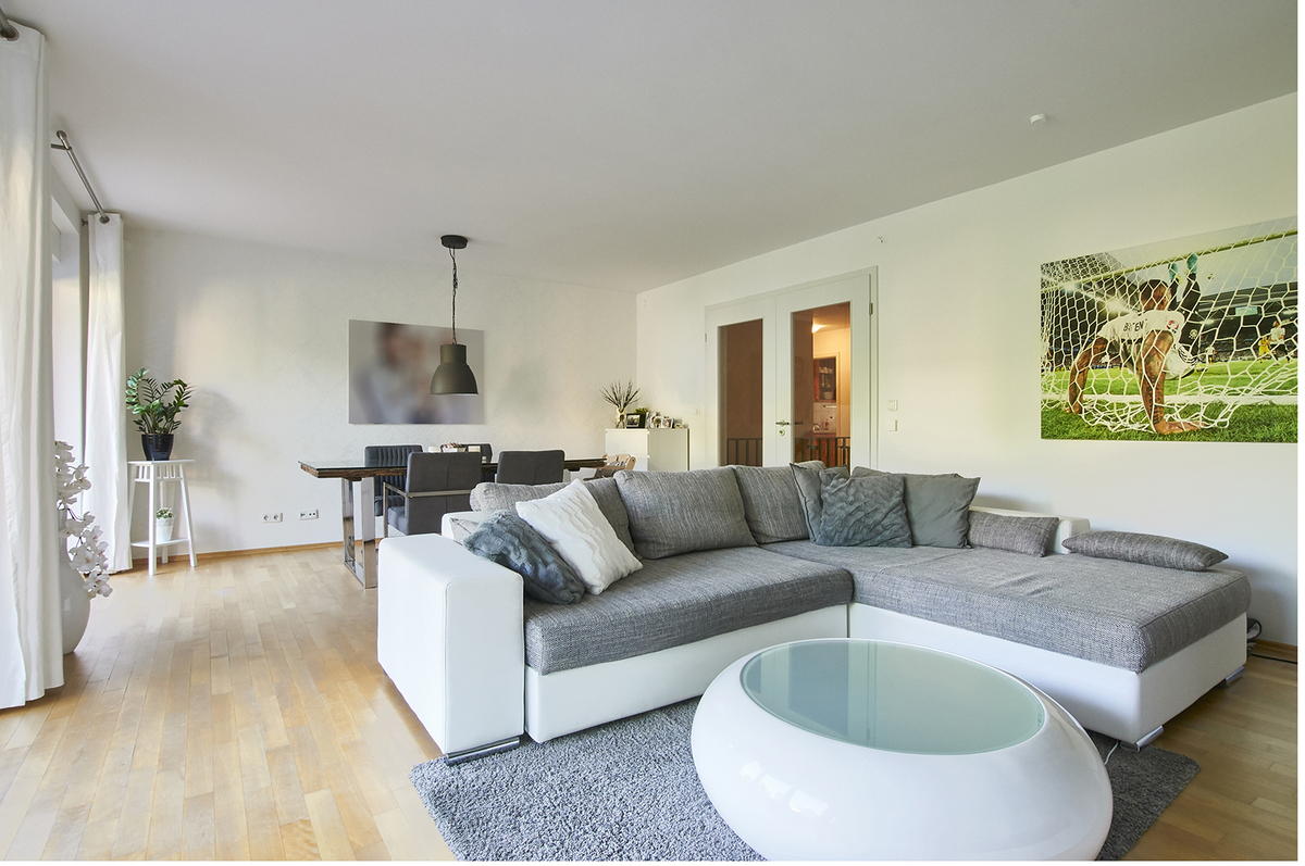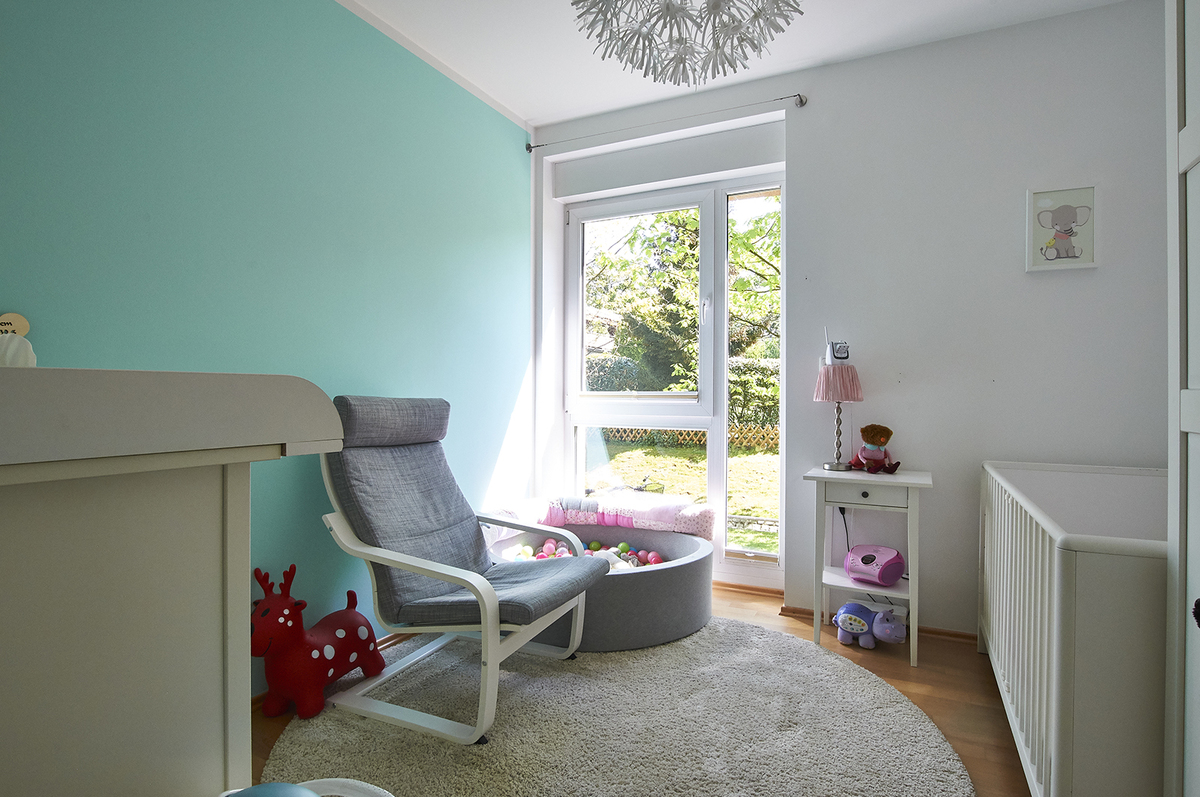 Der ca. 31m² große Wohn-/Essbereich ist lichtdurchflutet, großzügig und bietet direkten Zugang zur Südterrasse. Des Weiteren verfügt die Wohnung über ein helles Kinderzimmer mit bodentiefem Fenster und ein geräumiges Schlafzimmer.