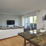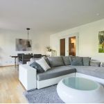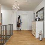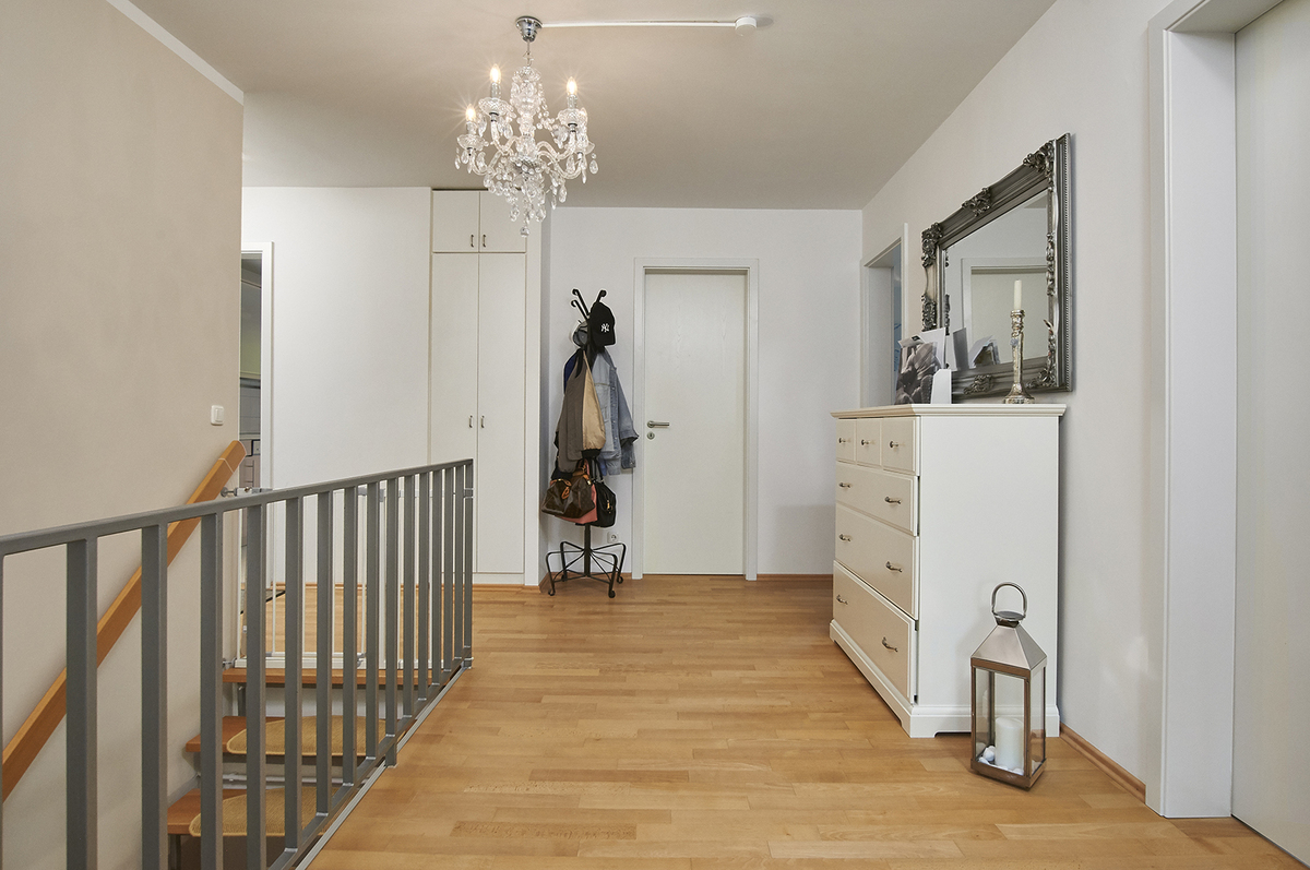 Über einen großzügigen, zentralen Flur sind alle Räume direkt zugänglich. Die Wohnräume sind mit hellem Buchen-Parkettboden, die Küche und das Bad