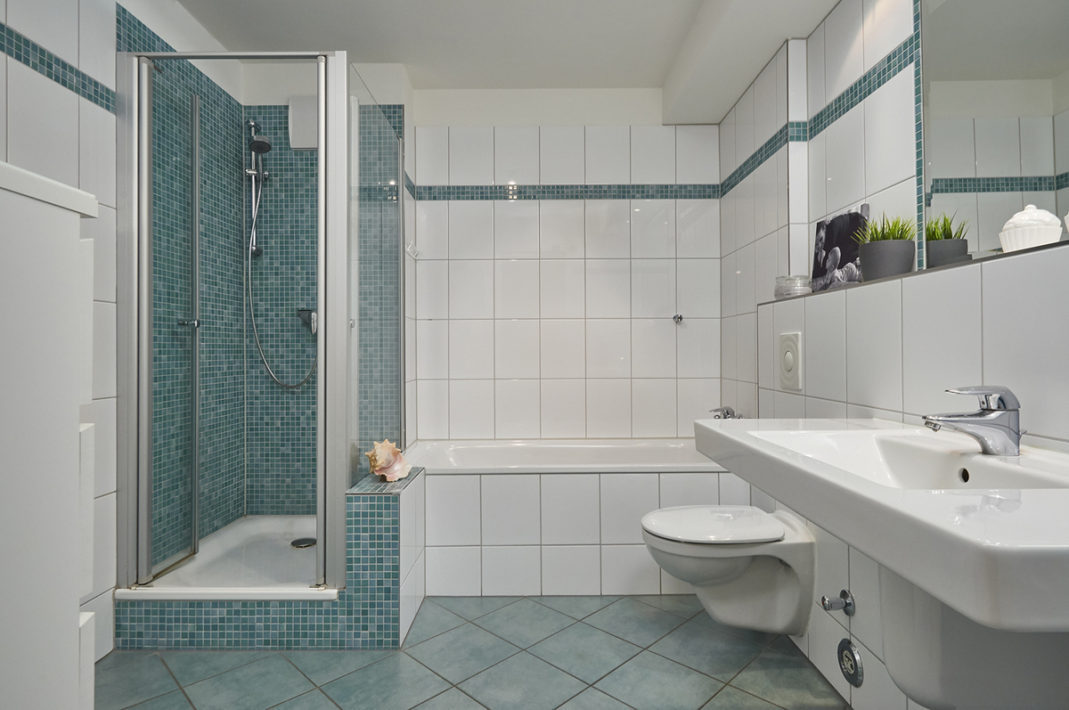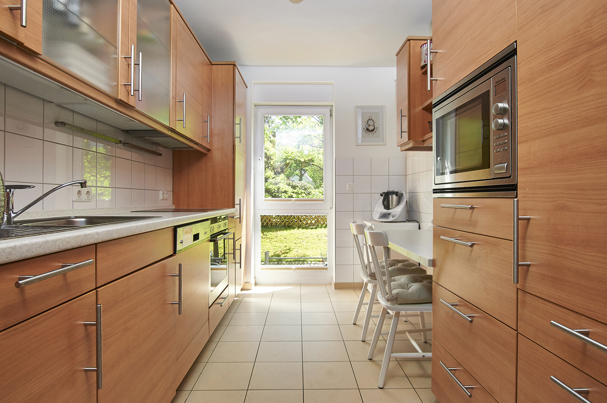 Das Vollbad verfügt über ein wandhängendes WC, Waschtisch, Dusche und Badewanne. Eine moderne, sehr helle Einbauküche mit Marken- Edelstahlgeräten (Backofen, Geschirrspüler und Mikrowelle) rundet dieses Angebot ab.